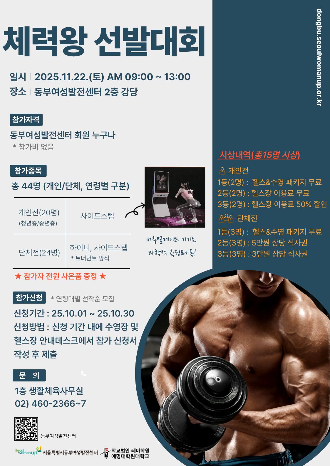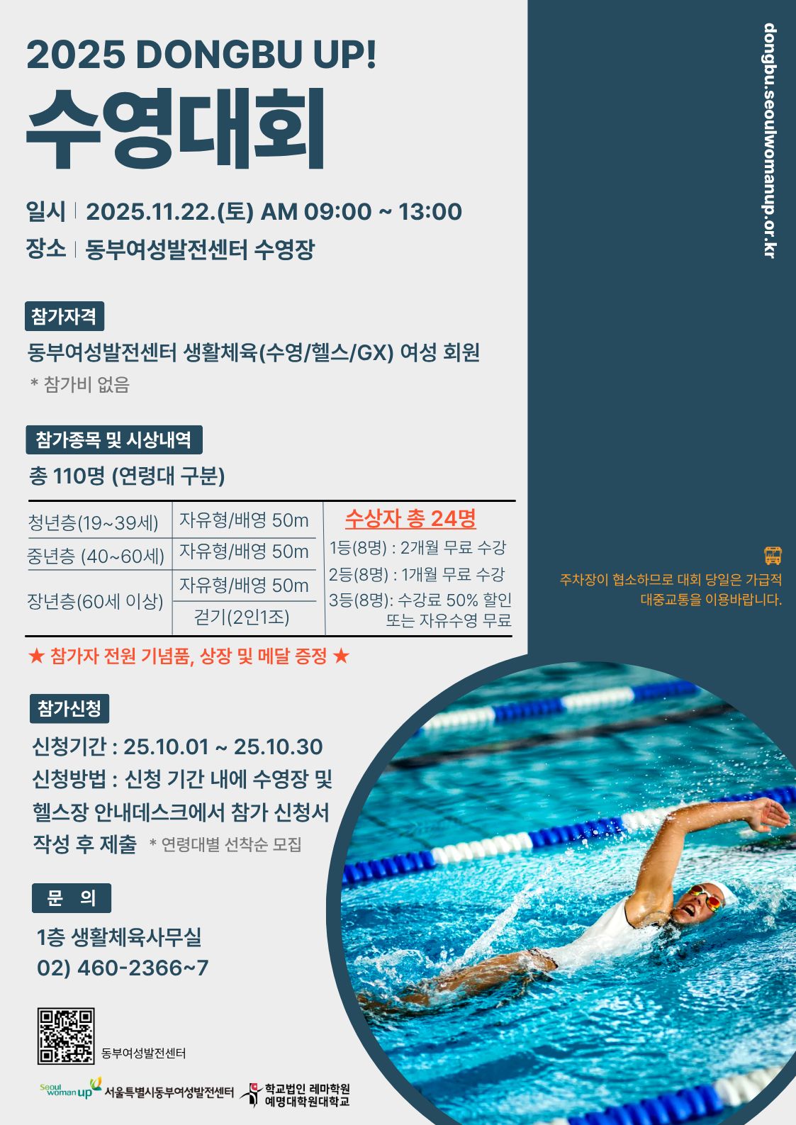 동부여성발전센터 회원님들이 참여하실 수 있는 수영대회 및 체력왕 선발대회가 아래와 같이 개최됩니다.