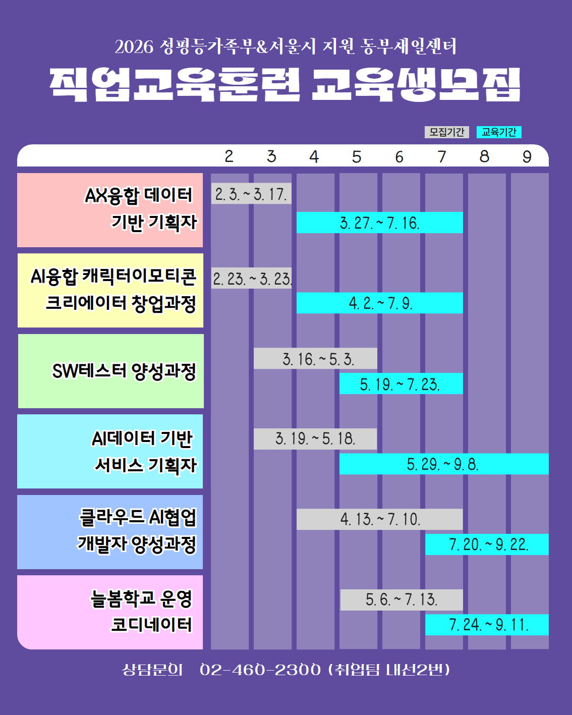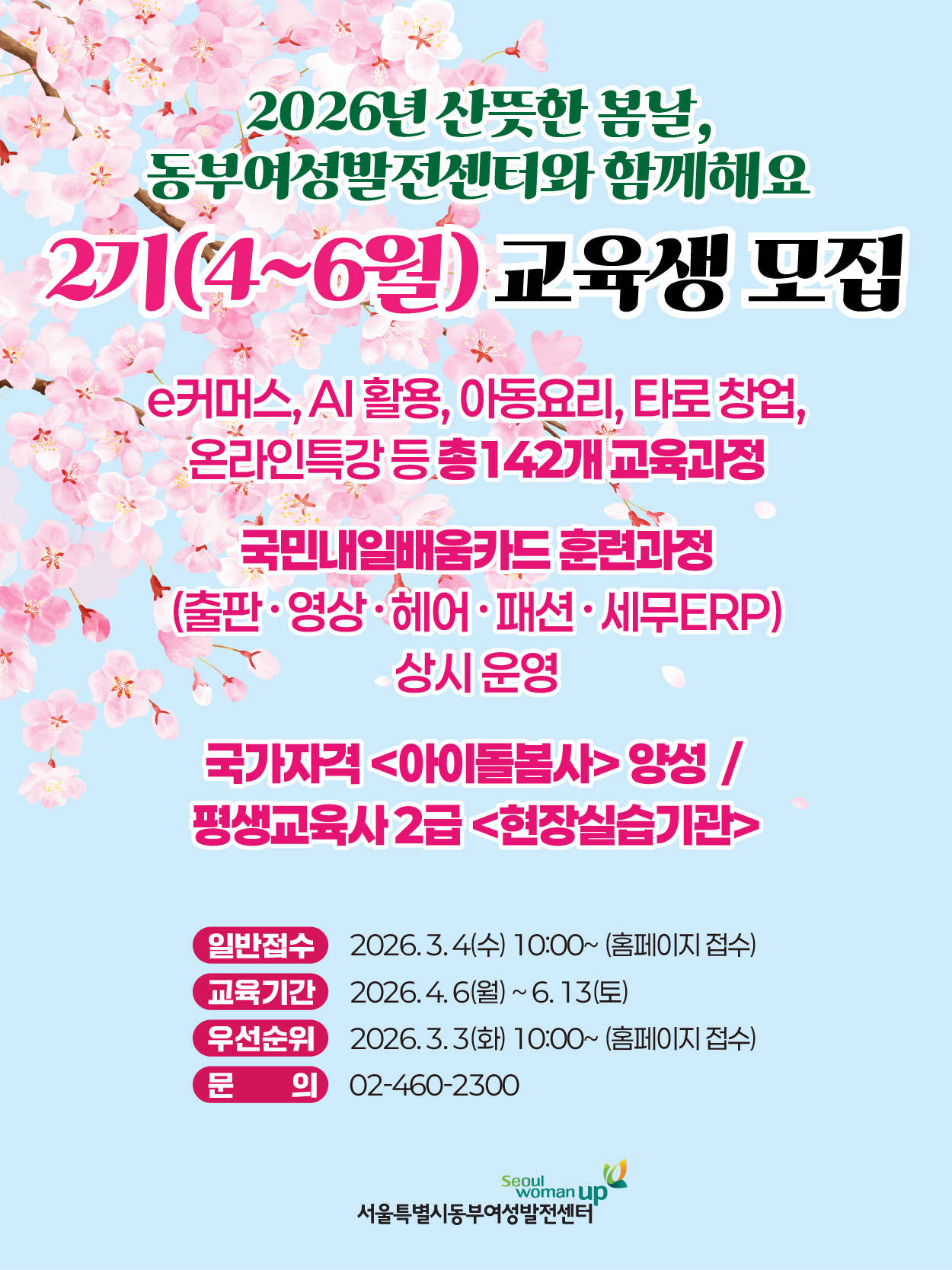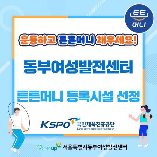 다중 게시판 공지사항 교육정보 구인정보 공지사항 [모집] 2026년 동부새일센터 경력단절예방지원사업 "바꿀래? 오피스" 기업환경개선 신청 기업 모집 [교육] 2025 동부의 빛나는 강사님들의 BEST 강좌 추천 [공지] 다둥이 행복카드 소지자 교육비 면제 시행 안내 [공지] 2025년 4기 동부여성발전센터 칭찬 이벤트 당첨자 발표 생활체육 회원 대상 「발건강관리 _김수자교수 무료 특강」 진행 채용 [채용] 2026년 관리팀 직원(계약직) 채용 공고 2026년 생활체육 아쿠아 강좌 파트타임 강사 채용 공고 [채용] 2026년 계약직 직원(새일센터 사업지원인력) 채용 최종 합격자 공고 [채용] 2026년 계약직 직원(새일센터 사업지원인력) 채용 서류전형 결과 및 면접시험 공고 [마감] 2026년 계약직 직원(새일센터 사업지원인력) 채용 공고(~2/23까지) 공지사항 더보기더보기 교육 컴퓨터 기초 OA 기초(PPT&엑셀) [자격증] ITQ 엑셀 오피스 실무 패키지(한글,ppt,엑셀) [자격증] 컴퓨터 활용능력 2급 수영·헬스 라인댄스 줌바댄스 셔플댄스 셔플댄스초급 헬스 교육 더보기더보기 구인정보 [늘푸른돌봄센터] 생활복지사 구인정보 더보기더보기